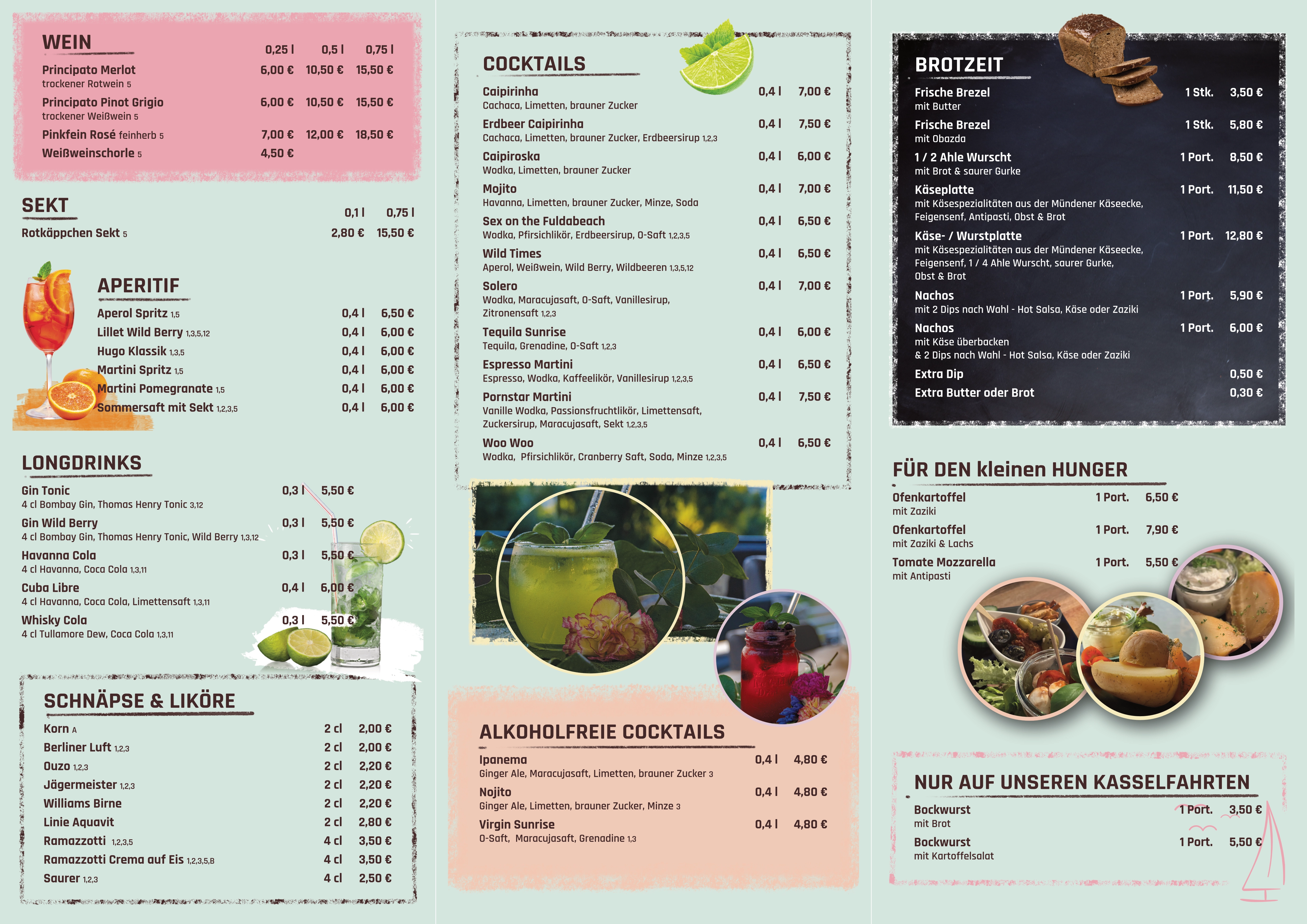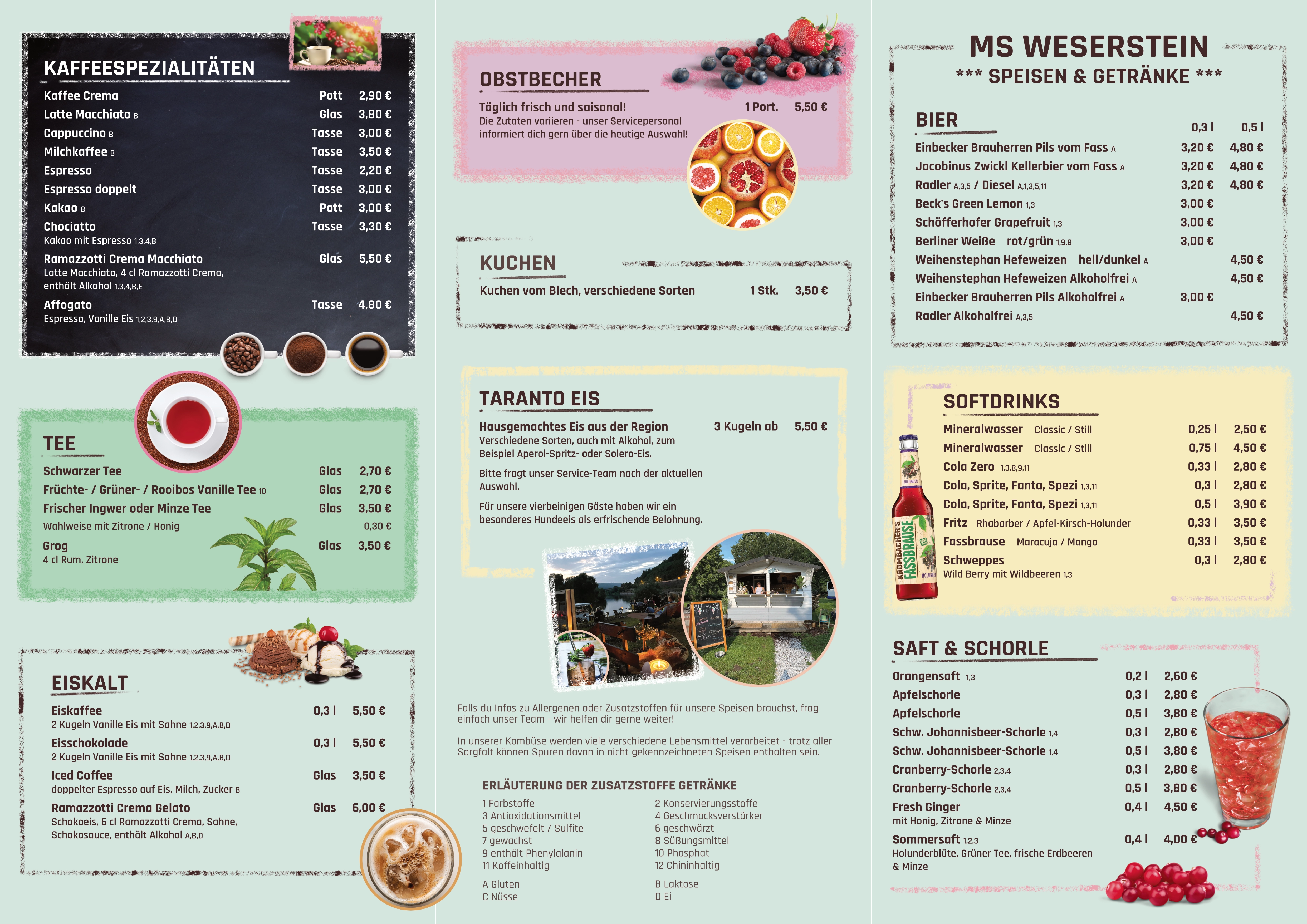 Hier findet ihr das Angebot unserer Speisen und Getränke an Bord. Neben unserem “Standart-Sortiment”, erwartet euch eine Auswahl an verschiedenen Eissorten, sowie wechselnde Specials. Über diese informieren wir euch regelmäßig auf unseren Social Media Kanälen und auf unserer Startseite unter der Rubrik News.